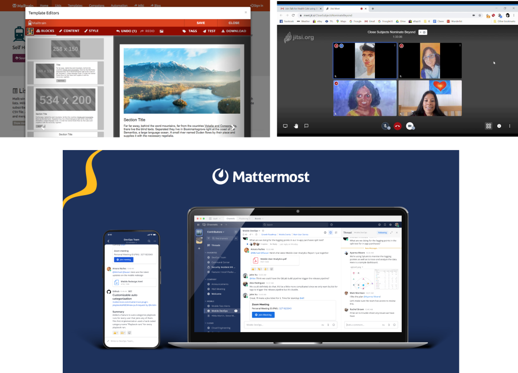 Alternatives to Gmail, Zoom, Whatsapp, Mailchimp, Facebook, etc.Since the beginning of internet, before Whatsapp, Instagram, Zoom, Slack, Microsoft and other big tech mainstream corporations, folk would self-manage their own means of communication. There are plenty of tools like Mailman, Roundcube, Postfix, Mailtrain, Thunderbird, Mattermost, Jitsi Meet, Nextcloud and Signal.